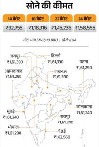 दिल्ली ईरान के साथ अमेरिका और इजरायल की जंग का व्यापक असर देखने को मिल रहा है। इसी जंग के चलते चांदी-सोने की कीमतों में आज 13 मार्च को गिरावट देखने को मिल रही है। इंडिया बुलियन एंड ज्वेलर्स एसोसिएशन (IBJA) के मुताबिक 10 ग्राम 24 कैरेट सोना 1,748 रुपए गिरकर 1.58 लाख रुपए पर आ गया है। इससे पहले 12 मार्च को सोना 1,60 लाख रुपए प्रति 10g था।