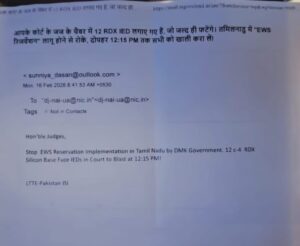 नैनीताल  उस समय जिला न्यायालय में हड़कंप मच गया है। जब एक संदिग्ध ईमेल के जरिए  न्यायालय परिसर में आरडीएक्स और आईईडी लगाए जाने की बात कही गई है। ये सूचना मिलते ही पुलिस और सुरक्षा एजेंसियां अलर्ट मोड पर आ गईं हैं। मेल में कहा गया है कि कोर्ट परिसर में 12 आरडीएक्स आधारित आईईडी लगाए गए हैं, जो दोपहर करीब 12:15 बजे विस्फोट कर सकते हैं।